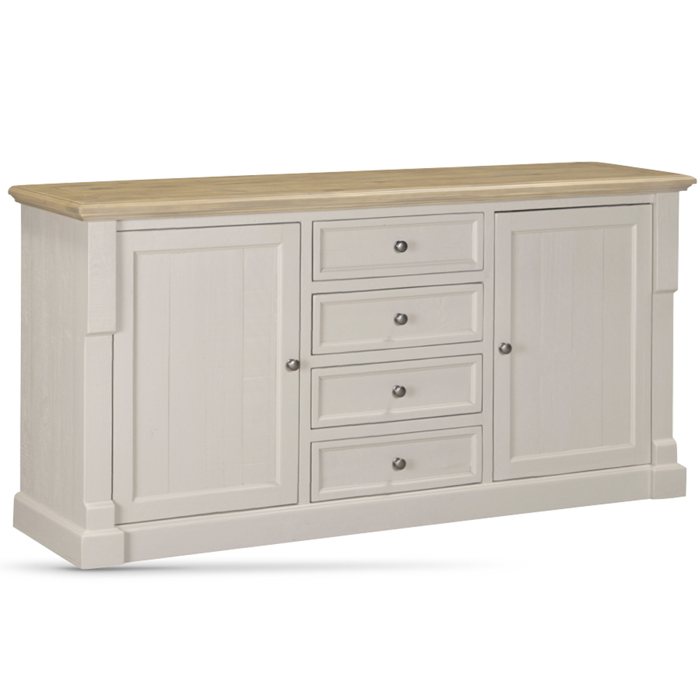The Chilton Wooden Sideboard With 2 Doors 4 Drawers Grey and Natural is a sophisticated storage solution designed to enhance both the style and functionality of your home. Featuring a refined combination of soft grey and natural wood tones, this sideboard brings warmth and contemporary elegance, making it a perfect fit for modern, Scandinavian, and transitional interiors. Crafted with practicality in mind, the Chilton sideboard offers generous storage to keep your space organised and clutter-free. With four spacious drawers and two cupboard doors, it provides versatile storage for tableware, linens, and everyday essentials, while the clean-lined design ensures a polished and timeless look. The Chilton Wooden Sideboard With 2 Doors 4 Drawers Grey and Natural delivers the perfect balance of elegant design and practical storage. It is an excellent choice for those seeking a stylish sideboard that enhances organisation while elevating the overall look of their home. FEATURES : Material : Wooden Finish : Grey, Natural Introducing our Natural Occasional Furniture Collection, the Chilton Range in our new Grey painted finish Crafted from beautiful Pine to bring a warm, natural charm to your home, each piece in this collection exudes a unique, rustic character, blending timeless design with the organic beauty of pine wood Perfect for adding a cosy, countryside feel to any room, these versatile pieces are designed to fit seamlessly into your living or dining spaces Whether youre looking for a statement sideboard or a charming coffee table, this small collection offers the perfect blend of style, functionality, and rustic appeal Stylish grey and natural finish for a modern, timeless aesthetic Four smooth-glide drawers ideal for organised storage Two cupboard doors offering spacious concealed storage Wide top surface suitable for decor, serving, or display items Clean, minimalist design complements a range of interior styles Easy-to-maintain surface